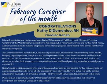 Join us in celebrating Kathy DiDomenico, RN, Cardiac Rehab at Fall River Health Services, as she receives the well-deserved recognition of being named February's Caregiver of the Month! With her unwavering commitment to providing personalized care and helping patients achieve their goals, Kathy truly embodies the spirit of excellence in healthcare. Congratulations on this outstanding achievement!