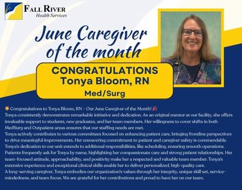 Congratulations to Tonya Bloom, RN FRHS Med/Surg, on being named our June Caregiver of the Month! ???????? Your exceptional nursing skills, compassionate care, and dedication to your patients and colleagues make you truly deserving of this recognition. Thank you, Tonya, for setting an outstanding example for all of us at Fall River Health Services. Well done!