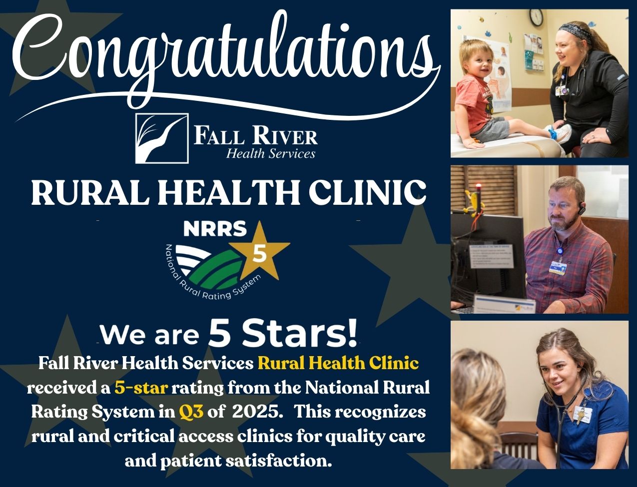 Huge congrats to Fall River Health Services Rural Health Clinic on earning a 5-star rating from the National Rural Rating System! This well-deserved recognition highlights the clinics outstanding commitment to quality care and patient satisfaction in our rural community.