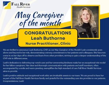 Congratulations to Leah Burthorne, CNP, our May Caregiver of the Month! Your dedication, hard work, and commitment to excellence have earned you this well-deserved recognition. Thank you for all that you do!