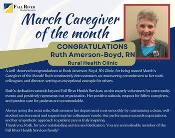 Congratulations to Ruth Amerson-Boyd, RN, our outstanding Caregiver of the Month for March! Ruth's vital role in the clinic has not gone unnoticed. Her exceptional work, commitment to excellence, and dedication to patient care make her a truly deserving recipient of this recognition. Well done, Ruth!